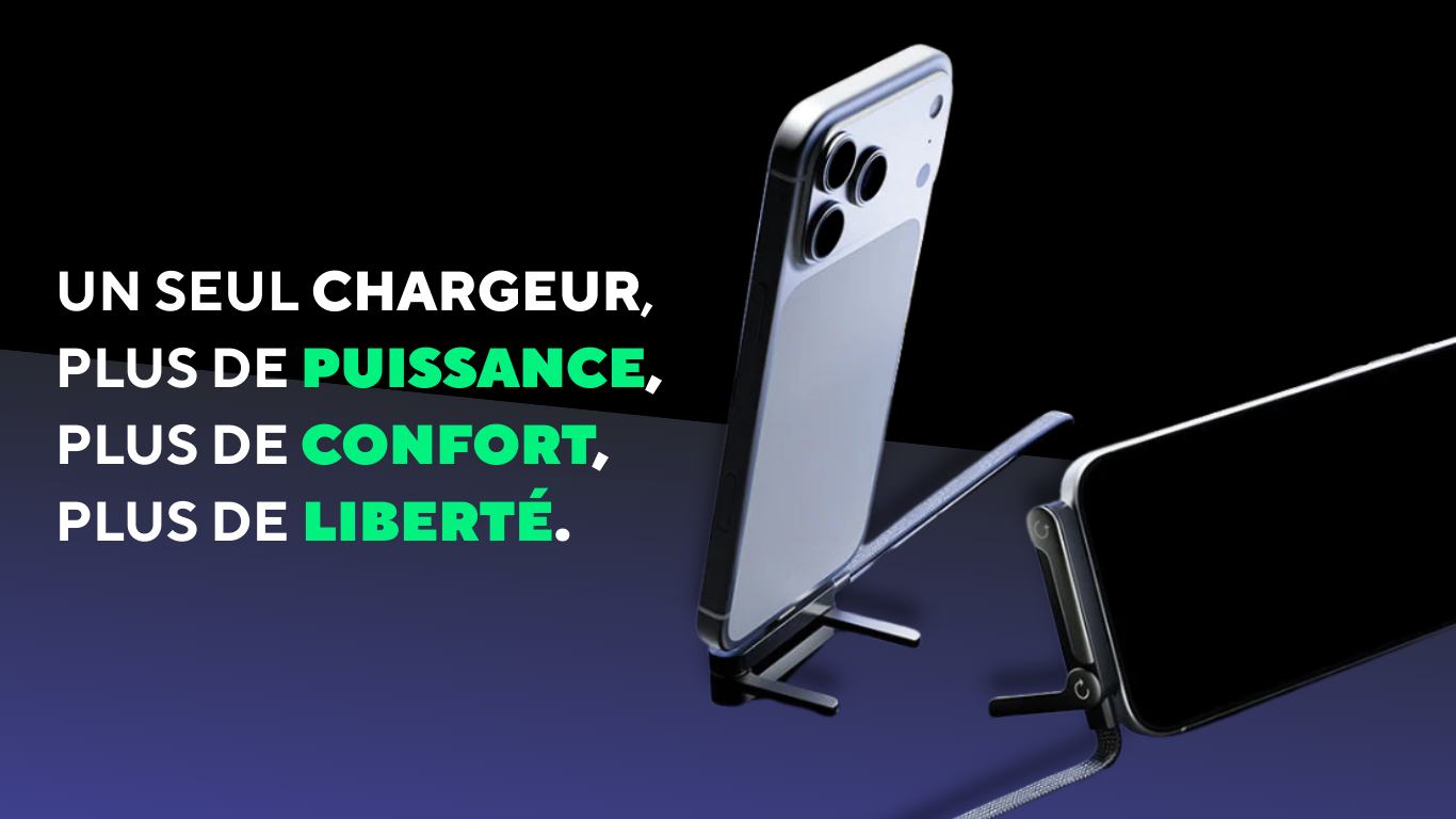 Avec une puissance de 240 W, EezyCharger peut recharger un iPhone 17 à 50 % en seulement 20 minutes. Vous pouvez jouer, regarder des vidéos ou travailler pendant que votre appareil se charge.